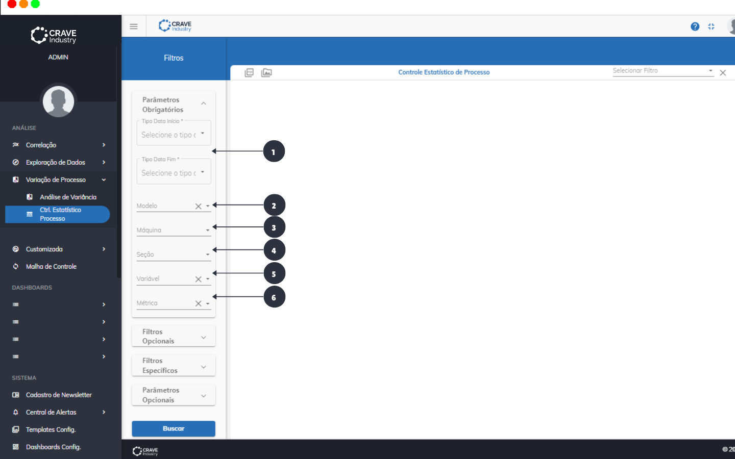 Na tela principal do Controle Estatístico de Processo, selecione suas opções à esquerda.
