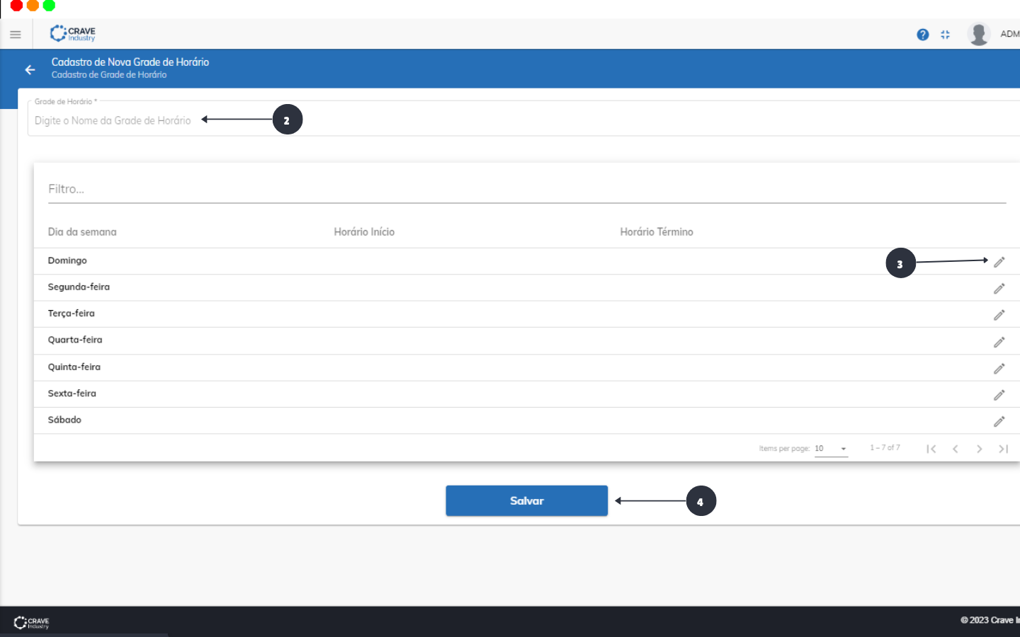 A Cadastro de Grade de Horários permite que você crie diferentes grades de horários para posteriormente utilizar como filtro em diversas das ferramentas e funcionalidades da Crave Platform, tudo isso, personalizado à sua organização.