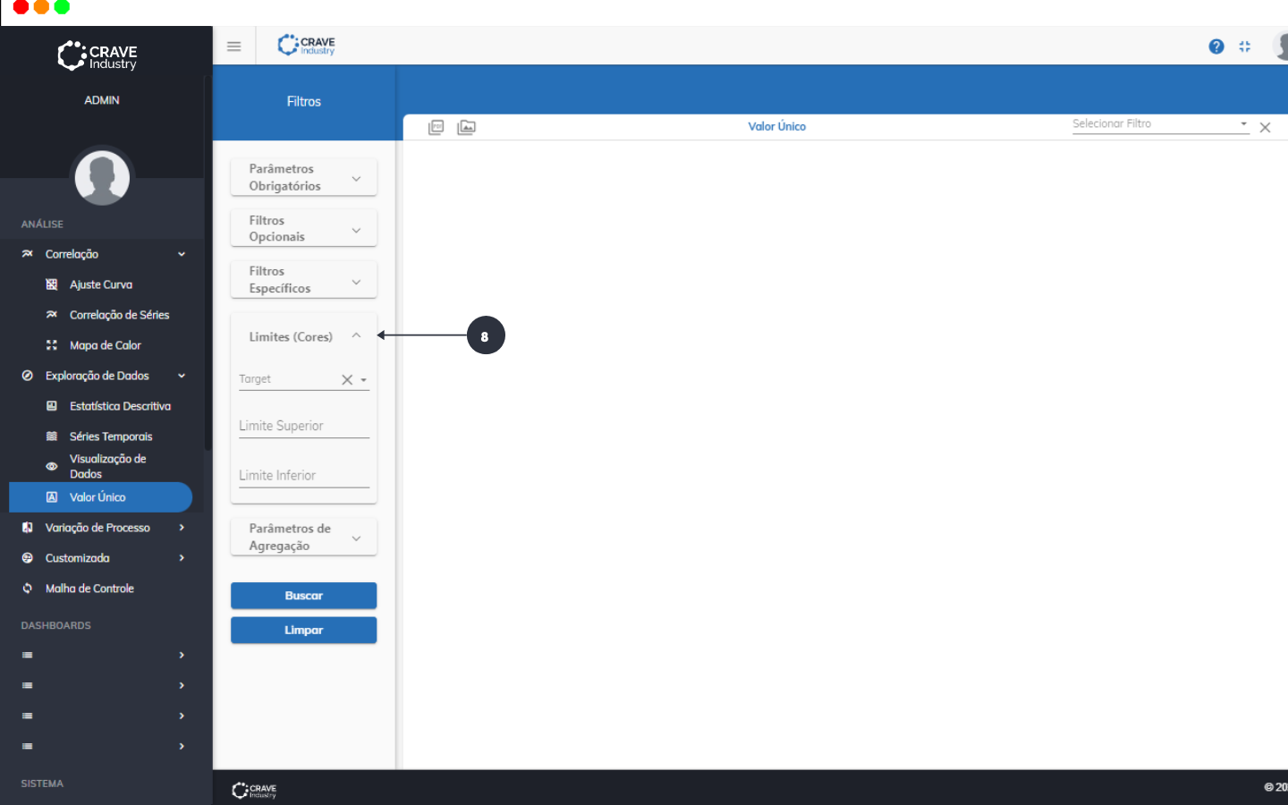 Limites: você pode definir limites como “Constantes”, "Limites Qualidade" ou como “Variável Target”, como um ponto de ajuste. Como “Constantes”, os limites definidos. Limite Superior e Limite Inferior, permite exibir o valor do Campo Variável e aplicar uma cor que indique seu estado (verde: dentro dos limites e amarelo: fora dos limites). Como “Variável Target”, a análise passa a considerar do valor da Variável Target.